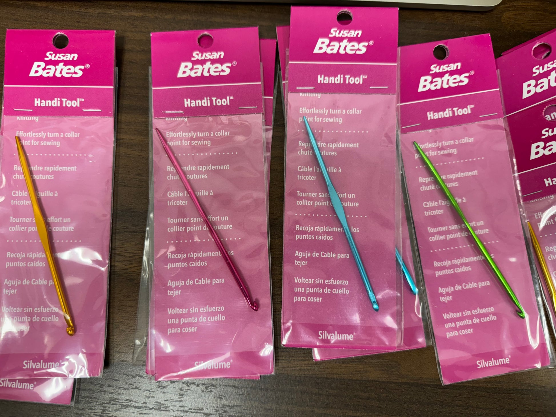 A crochet hook on one end and a knitting needle (US 3) on the other, the Susan Bates Silvalume Handi Tool is a must-have for your notions pouch! It's ideal for picking up dropped stitches, picking up stitches along an edge, and can be used as a cable needle. Available in an assortment of 6 cheerful colors. Measures approximately 4" in length.